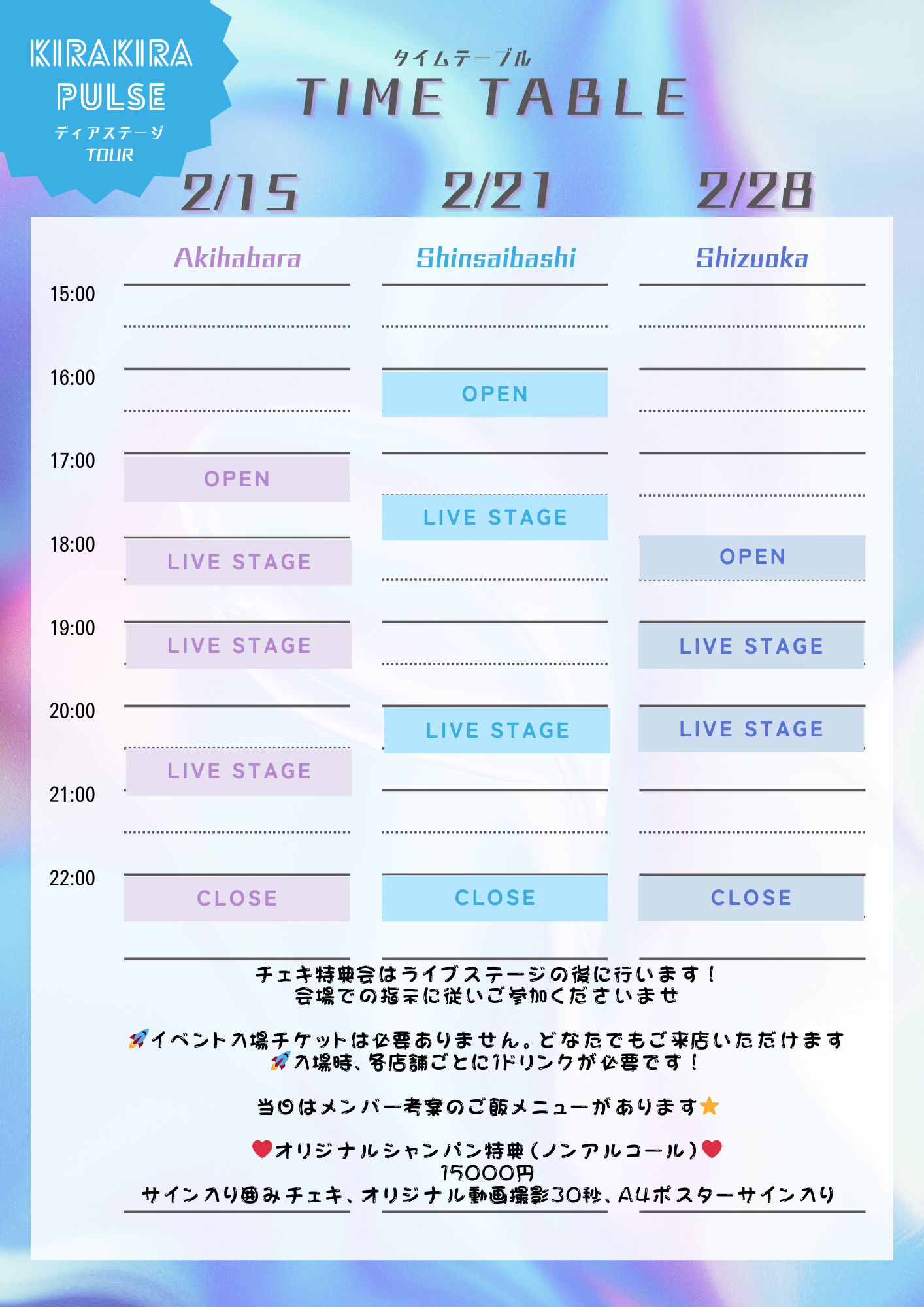 KiraKira Pulseが秋葉原・心斎橋・静岡のディアステージ各店舗をツアーしちゃいます! 入場チケットは必要ありません。どなたでもご来店いただけます! ※各店舗毎にドリンク代が必要になります